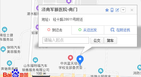 医院地址:济南市槐荫区经十路28611号 市区乘坐公交车到院:7、19、20、38、78、126、K56、K156、K157公交车到"军颐医院(明星小区站)"下车往回走50米即可。 医院免费咨询电话:0531-87183993 门诊时间:早8:00-晚20:00节假日不休